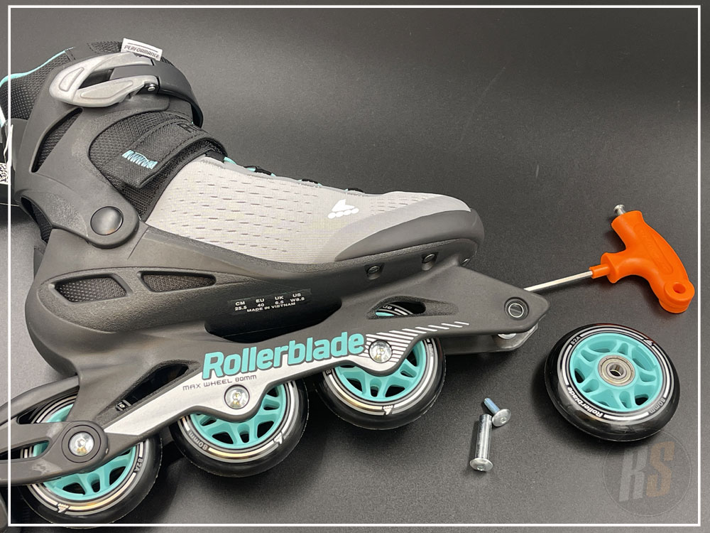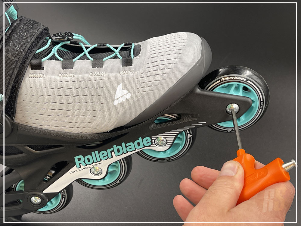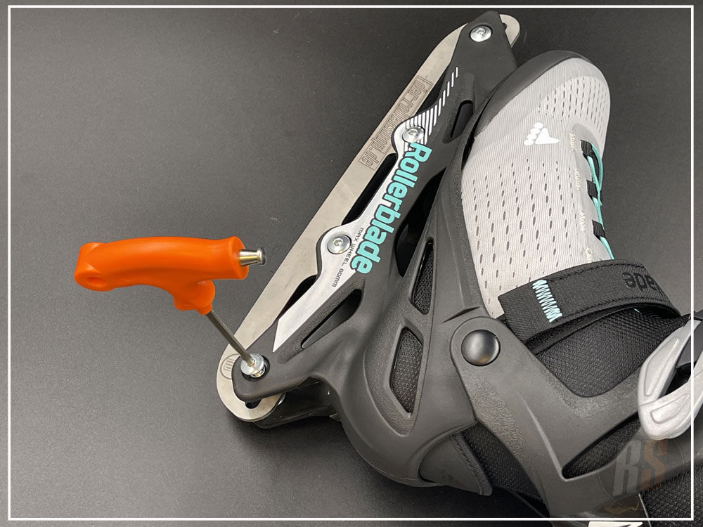 Um die Eiskufe montieren zu können, musst du die Rollen aus den Inlineskates ausbauen.Wichtig: Nutze das passende Werkzeug enztsprechend der Achsen. In den meisten Fällen wird dies ein 4mm Standard Innensechskantschlüssel sein. Manche Hersteller nutzen auch Torx-Köpfe. Bei zweiteiligen Achsen bzw. Schrauben mit gegenstück benötigst du zwei passende Werkzeuge.
