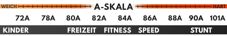 Die Härte der Rollen ist neben dem Durchmesser ein weiterer entscheidender Faktor für die Fahreigenschaften eines Inlineskates. Die Härte der Rollen wird allgemein mit Hilfe der a-Skala angegeben. Je höher die angegeben Zahl vor dem "a" ist, desto härter ist die Rolle. So ist eine Rolle mit 86a härter als eine Rolle mit 80a Härte.