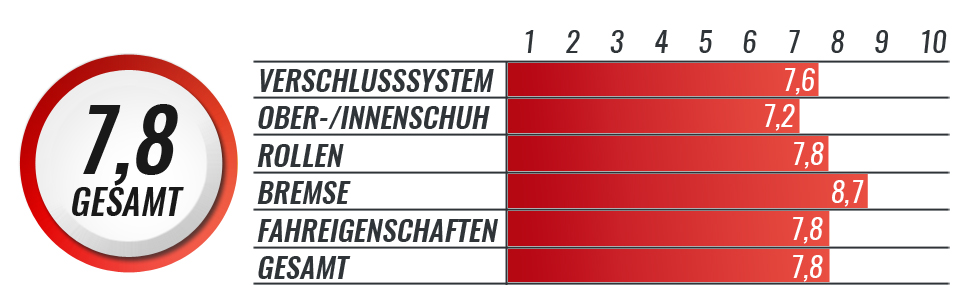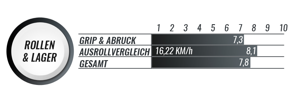 Die Rollen des K2 V02 100 X Pro sind echte Allrounder und funktionieren auf verschiedenen Untergründen sehr gut. Allerdings sind die Rollen mit einer Härte von 83a relativ weich. Dadurch ergeben sich nicht so gute Werte beim Ausrollvergleich und eine schlechtere Bewertung beim Abdruck, der Grip ist hingegen erwartet gut.