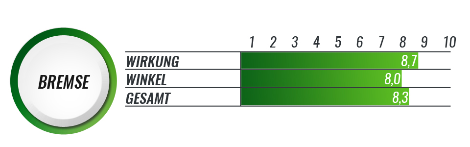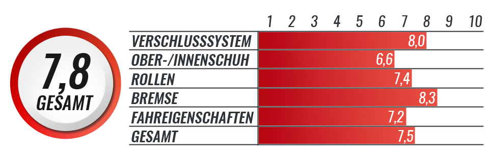 Die Bremswirkung des K2 VO2 90 Boa wurde in unserem Test mit einer sehr guten 8,7 bewertet. Die Bremse wurde zusammen mit dem Skate konstruiert und hat dadurch einen optimalen Winkel. Es lässt sich schnell und effektiv bremsen ohne den Fuß zu sehr heben zu müssen. Der Stopper greift gut in den Asphalt.