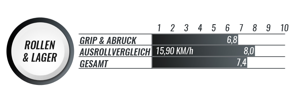 Die Rollen des K2 VO2 90 Boa sind echte Allrounder und funktionieren auf verschiedenen Untergründen sehr gut. Allerdings sind die Rollen mit einer Härte von 83a relativ weich. Dadurch ergeben sich nicht so gute Werte beim Ausrollvergleich und eine schlechtere Bewertung beim Abdruck, der Grip ist hingegen erwartet gut.