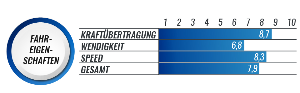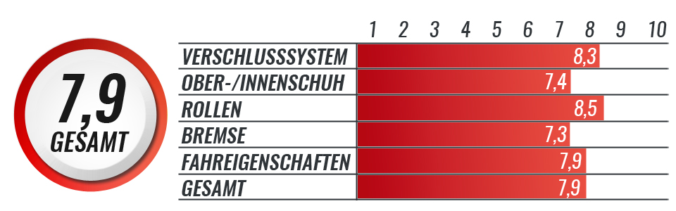 Vor allem die Kombination der Ausstattung macht den Powerslide Marathon 110mm zu einem echten Streckenfresser. Das Verschlusssystem in Kombination mit dem festen Oberschuh sorgen für eine sehr gute Kraftübertragung. Dabei bietet der Marathon aber noch relativ viel Komfort, was ein Pluspunkt bei gemütlichen Ausfahrten ist. Das sportliche Schienen-/Rollensetup ist bereits Wettkampftauglich, die Wendigkeit leider aber unter der längeren Schiene und den großen Rollen.