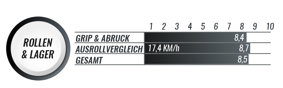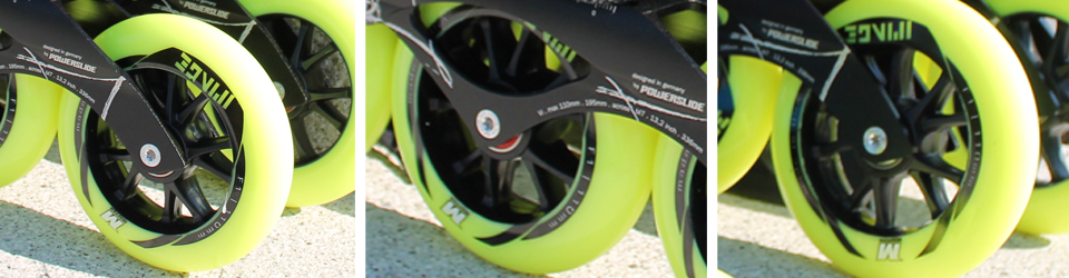 Das Schienen/Rollen-Setup des Powerslide Marathon ist bereits sehr sportlich und für die ersten Wettkampfversuche ausgelegt. Die Matter Image 110mm/F1 (84a) bieten sehr guten Grip und gutes Rollverhalten. Im Test, in dem Kriterium Ausrollvergleich, war der Powerslide Marathon ganz vorne dabei, Dies liegt auch an den WCD Abec 9 Lagern, welche von Anfang an sehr leichtläufig sind.