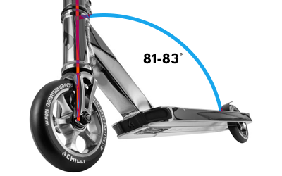 Dieser Winkel wird bei der Headtube mit angeben. Er beschreibt den Winkel, in dem die Headtube zum Deck steht. Mit abnehmendem Winkel neigt sich der Lenker mehr zum Deck. Stuntscooter verwenden in den meisten Fällen einen Lenkwinkel von 81-83 Grad.