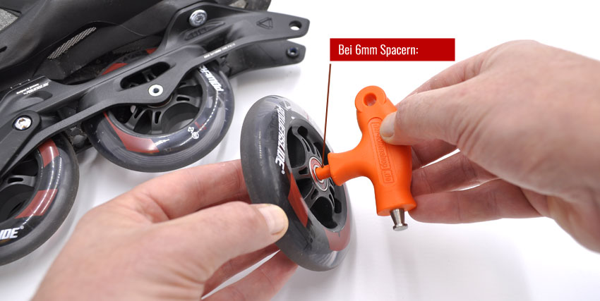 If your "old" bearings are still good and you only want to fit new wheels, the old bearings must now be removed from the worn wheels. 8mm axles: Use the mandrel of the tool to lever the bearings out of the wheels.
