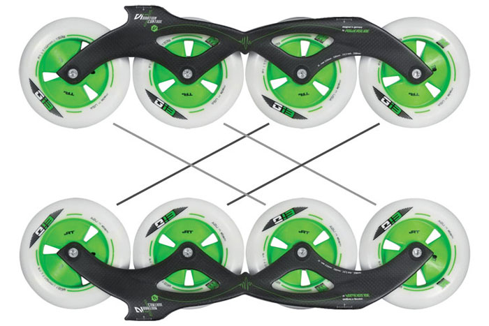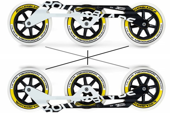 - the first wheels of the left skate is exchanged with the third wheel of the right skate