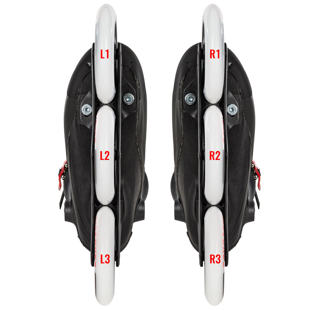 Bei Inlineskates mit drei Rollen gibt es verschiedene Optionen zum Kreuztausch.Eine Variante ist L1 auf R3, R1 auf L3 und L2 mit R2 tauschen.