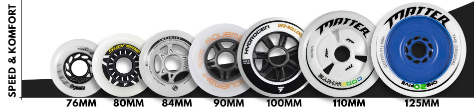 Zusätzlich kommen größere Rollen besser mit schlechten Untergründen und Unebenheiten zurecht. Allerdings wird bei größeren Rollen mehr Energie benötigt um auf Geschwindigkeit zu kommen.