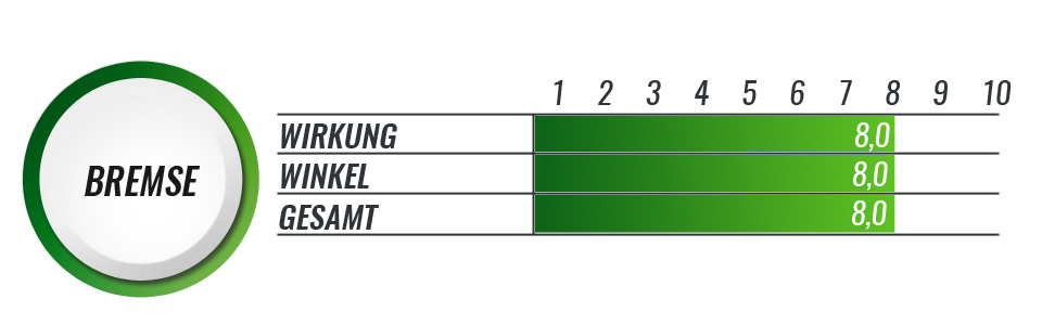 Speziell für die 125mm Modelle wurde von Powerslide eine eigene Bremse entwickelt. Diese ist aus Metall und stabil gefertigt. Der Winkel ist auf die Größe der Rollen abgestimmt. Durch den höheren Standpunkt ist das Bremse zunächst etwas knifflig, man gewöhnt sich aber schnell an den richtigen Bremspunkt.