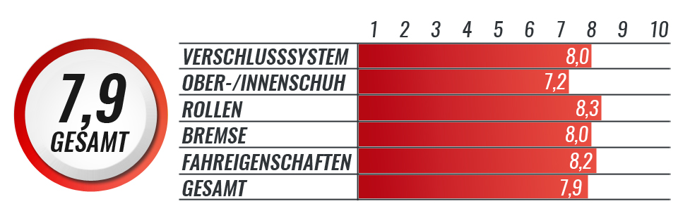 Der Powerslide Imperial Megacruiser ist mit 125mm Rollen in der Härte 85a ausgestattet. Die Härte der Rollen, die Powerslide Abec 9 Freespin Lager und auch das 125mm Konzept zeigten im Ausrollvergleich ihre Stärken. Mit einer Geschwindigkeit von 17,3 Km/h liegt der Megacruiser im oberen Drittel.