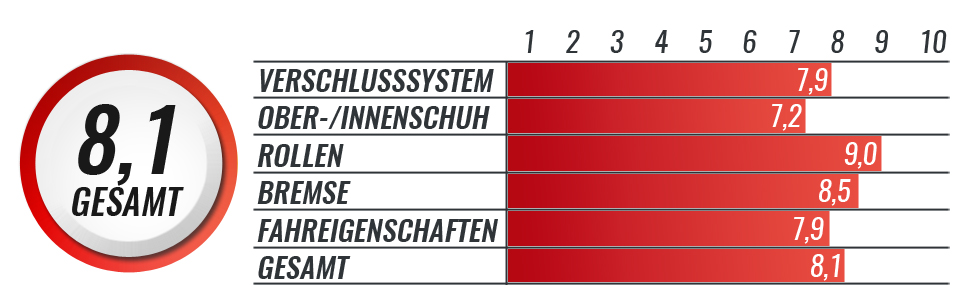 Der Rollerblade Tempest 110 c schneidet in unserem Skatetest insgesamt mit der Note 8,1 ab. Dies ist ein sehr guter Wert und dabei ist zu beachten, dass der Rollerblade Tempest ein Schuh ist, der sowohl die langen Touren, als auch einen Wettkampf erlaubt. Ein absoluter Allrounder für den sportlichen ambitionierten Fitnessskater.