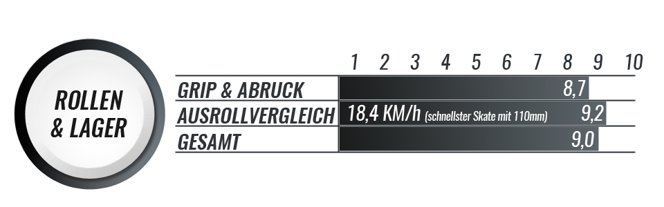 Die Verbesserung mit dem größten Einfluss ist das Upgrade auf die Rollerblade Hydrogen Rollen. Das gesamte Schienen/Rollen Setup ist sehr sportlich und mit wettkampftauglichem Material versehen. In dem Ausrollvergleich unseres Inlinskate Tests ist der Tempest das schnellste Serienmodell mit einer 4 x 110mm Konfiguration. Nicht nur die Geschwindigkeit auch der Abdruck und das Gripverhalten sind auf Höchstperformance ausgelegt.