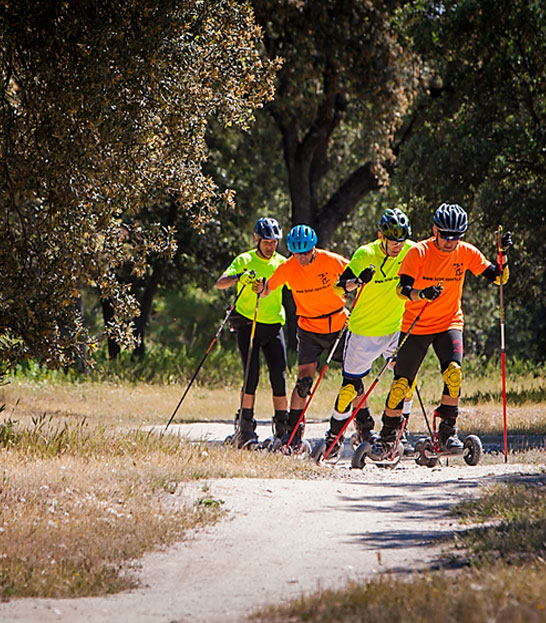 Entgegen der Bauweise der Nordic Cross Skates (mit Luftreifen) sind Rollski im Normalfall mit Gummi- oder PU-Rollen ausgestattet. Damit ist die Nutzung im Gelände zwar ausgeschlossen, es kommt aber echtes Skilanglaufgfühl auf. Zum einen durch die etwas längeren Schienen und niedrige Standhöhe, vor allem aber durch die Nutzung der Skilanglaufbindung. Diese wird auf die Aluminiumschiene geschraubt und macht die Nutzung der Skilanglaufschuhe auch im Sommer möglich. Skike und Powerslide bieten aber auch Schienen an, die mit Luftreifen und Skilanglaufbindung gefahren werden. Etwas mehr Bodenfreiheit als klassische Skiroller und die Luftreifen machen diese Modelle geländegängig und bieten komfortables Fahren auf der Straße. Wir empfehlen diese Kombinationen nur fortgeschrittenen Nordic Skatern mit Skilanglauferfahrung.