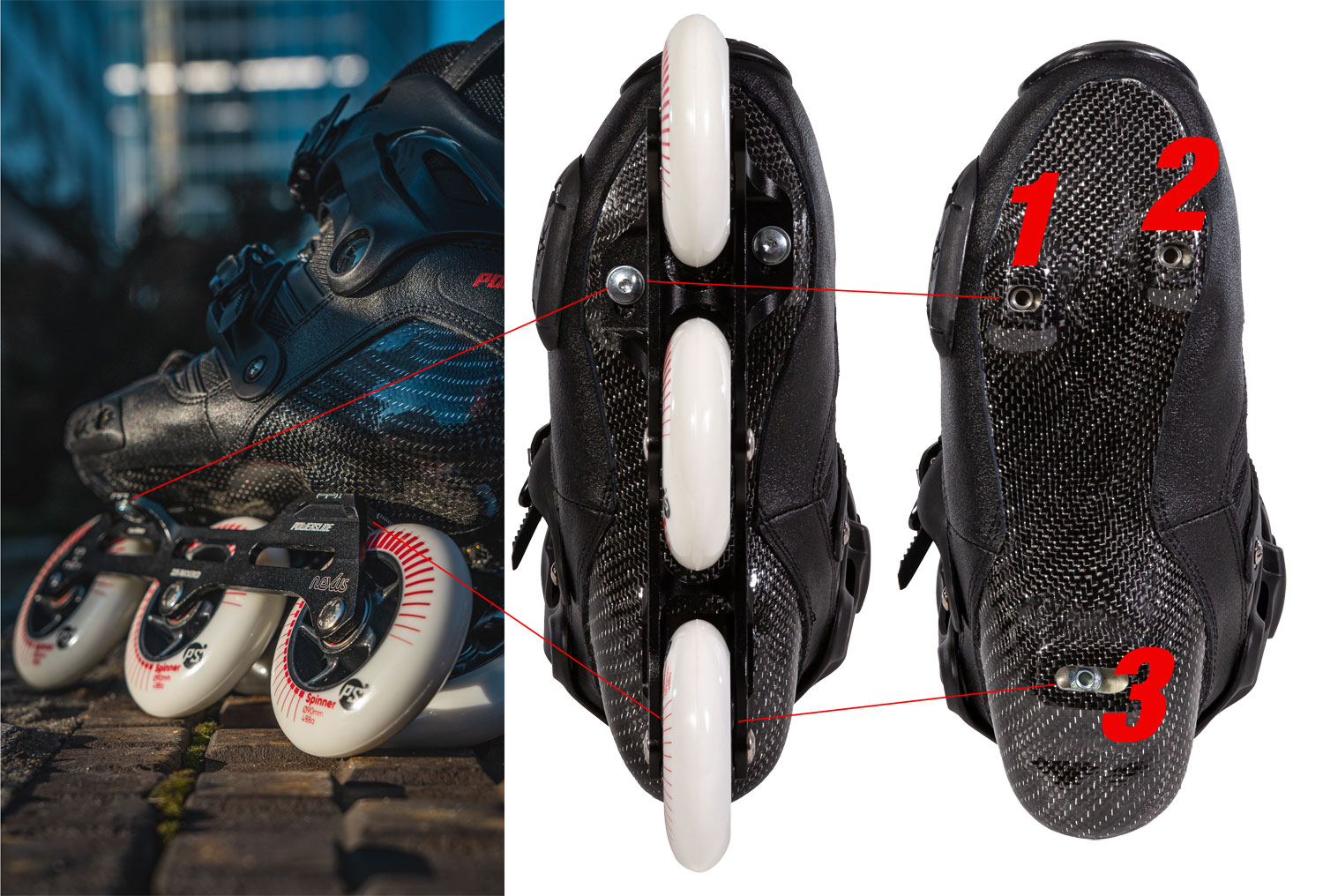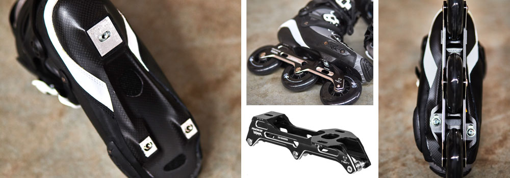 Die Entwicklung zu immer größeren Rollen stellt auch das Material vor neue Herausforderungen. Also hat man sich bei Powerslide die Frage gestellt, wie man diese Faktoren mit der Möglichkeit der schnellen, einfachen und verstellbaren Montage einer Skateschiene am Schuh kombinieren kann.