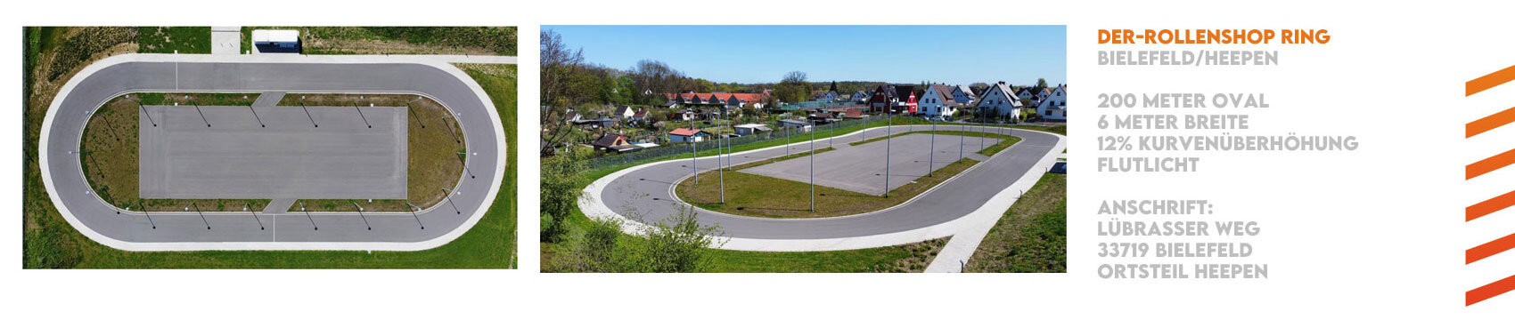 Ungefähr auf halber strecke kommen wir am Rollenshop-Ring vorbei - dem Trainingsgelände der Speedskatingabteilung des SV Heepen. Der Ring ist ein 200 Meter Oval mit leicht erhöhten Kurven aus perfektem Aspahlt. Ihr könnt unseren ca. einstündigen Aufenthalt also nutzen, um eure Fahrtechnik zu verbessern und das Fahrvergnügen auf dem Ring zu genießen. Der SV Heepen sorgt für die Verpflegung und musikalische Untermalung. Im Innenraum des Rings kann man seine Skills auf dem Geschicklichkeitsparcour beweisen, bevor wir uns auf den Rückweg zur Radrennbahn machen.